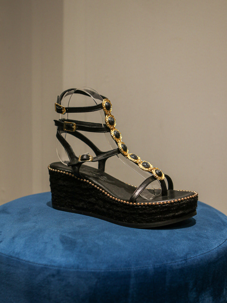 Nuestra sandalias griegas artesanales llevan joyas inspiradas en la Grecia antigua bañadas en oro de 24k y plata 999. Gracias a estos baños nuestra joyería nunca se oscurece ni envejece.